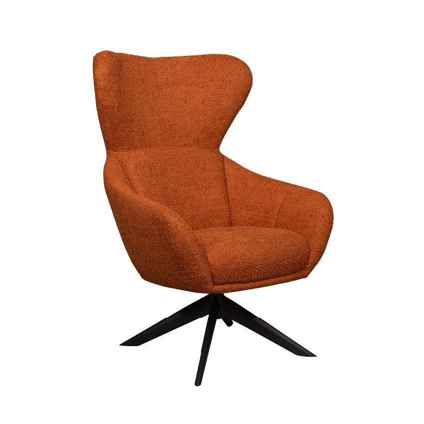 Het stoffen materiaal, uitgevoerd in een oranje kleur, geeft de stoel een warme en uitnodigende sfeer. De draaibare basis bestaat uit vier slanke, zwarte metalen poten die stabiliteit en een moderne uitstraling combineren. Benieuwd of deze fauteuil een stijlvolle toevoeging vormt voor uw interieur? Kom proefzitten bij onze dealers, de adviseurs staan voor u klaar.
