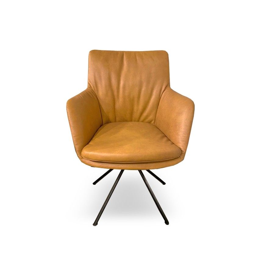Eetfauteuil Tanga van Framati is uitgevoerd in leder Moreno 1000 Sahara. De stoel staat op een zwarte draaivoet. Een fijne eetstoel voor langdurig tafelen! De Tanga is tevens leverbaar in meerdere uitvoeringen en met vast onderstel.